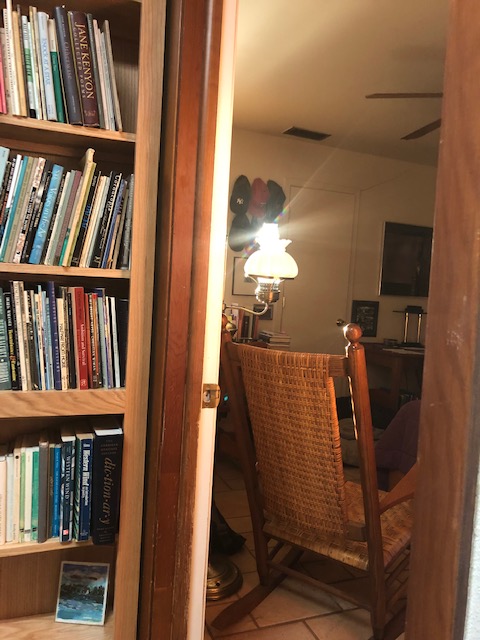 I understand. Why, in retirement, I have surrounded myself with the dead and the dying, new bookshelves, poetry collections, most by friends I can summon to my slat-backed, green-cushioned rocking chair and laugh at comparing my selection of W. S. Merwin’s Garden Time to Jesus calling his friend from the tomb, “Lazarus, come forth,” in my case to this cubby-hole of a space between the kitchen and the study, a space enclosed by words Lil and I hear–a still, small voice, that thin silence of sadness and joy.