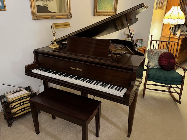 from her baby-grand piano filling