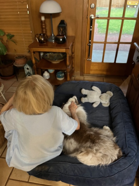 This has been an especially sad summer in Texas, with the tragedy of the flash flood that swept a huge wall of water through a long-time special church camp for children, Camp Mystic, on the Guadalupe River in the Texas Hill Country near Kerrville. At least twenty-seven lives were lost, most of whom were young girls. We have all grieved for their families. I know how maudlin this will sound, and you can’t see my tears as I am typing this, so I’ll go ahead and tell you I believe all those preschool and elementary school children have been waiting in heaven for Lucy, running up to welcome her with hugs and kisses, as she knew they would, so Sunday morning she stood up from her dog bed, said goodbye, and walked a few steps to where she lay down on the floor and ran to greet the children.