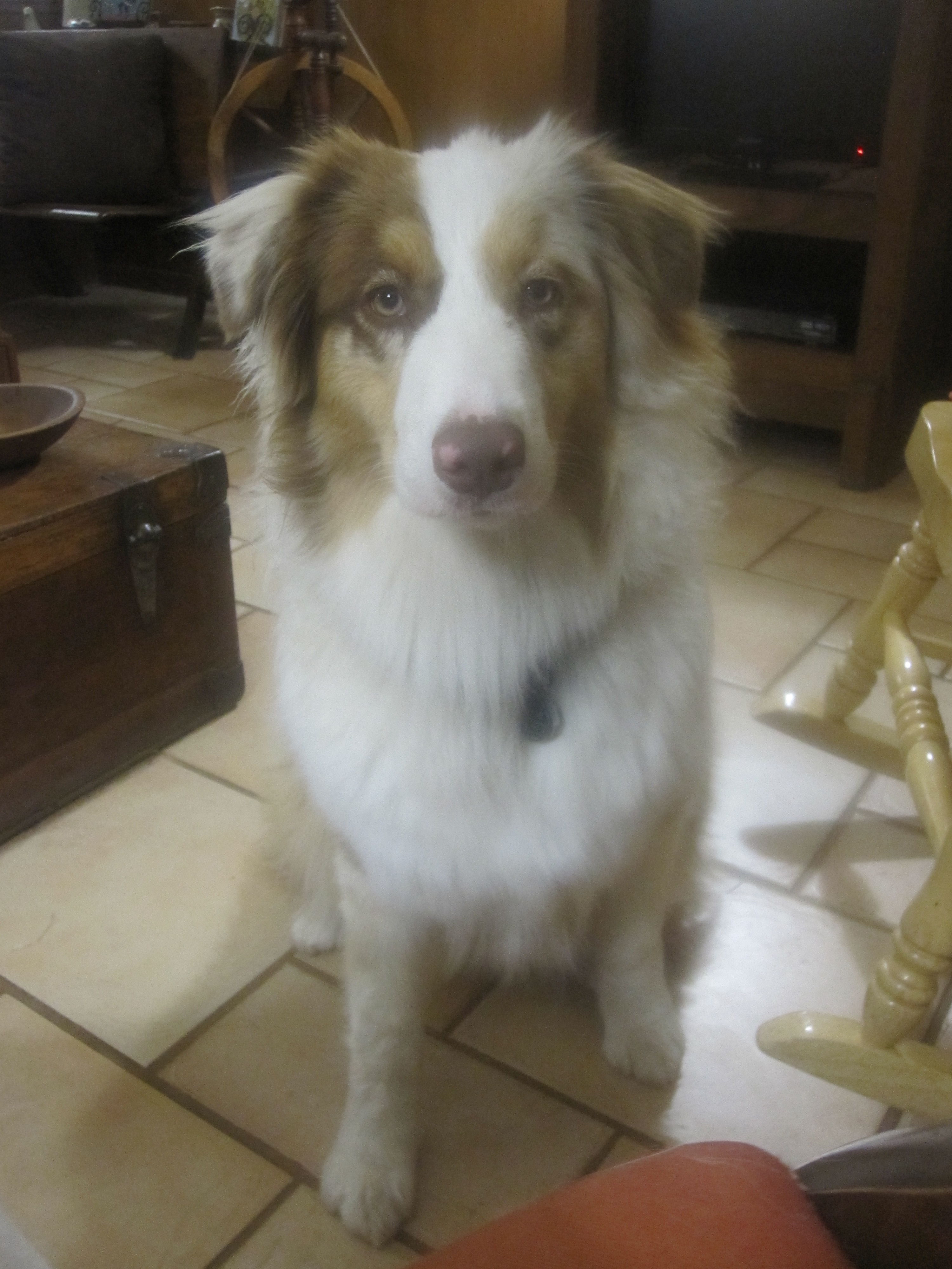 Strong, dark coffee helps and three or four squares of dark chocolate, a large Moleskine notebook, sharpened #3 Ticonderoga pencils, the phantom weight of Wrangler’s muzzle resting across my sandaled feet. It’s been a year without Wrangler, and I’m no better. Lucy is almost a year old, loving and needy, the most beautiful Australian shepherd dog of all our previous Aussies, Katrina’s pal. Lucy is not Wrangler. Get over it! I tell myself.